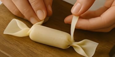 • ينتج شكل يشبه الحلوى الملفوفة بإحكام، مع وسط منتفخ قليلًا (يحتوي على الحشوة) وطرفين ملتفّين مثل ورق التغليف. 🍭
